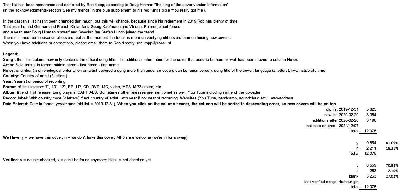 List researched and compiled by Rob Kopp. Email Rob with any additions or corrections: rob.kopp@xs4all.nlClick here ⓘ for information on the list. Also check out Stefan's lists of Kinks covers released on 7" vinyl singles